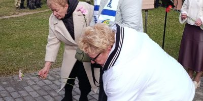 Участники митинга минутой молчания почтили память узников фашистских лагерей смерти, после чего возложили к памятному знаку красные гвоздики и зажгли лампадки